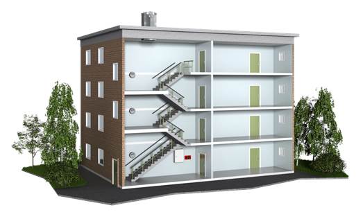 4 storey apartment block with a single common staircase connecting directly to residences with a need to achieve smoke control to allow for simultaneous evacuation of the building during a fire and smoke extract to clear the building after the fire has been extinguished.