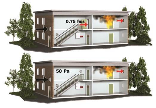 Pressurisation systems are used to create smoke free escape routes. Normally the fan is running at a certain speed to obtain the 50 Pa overpressure needed to create a safe escape route.