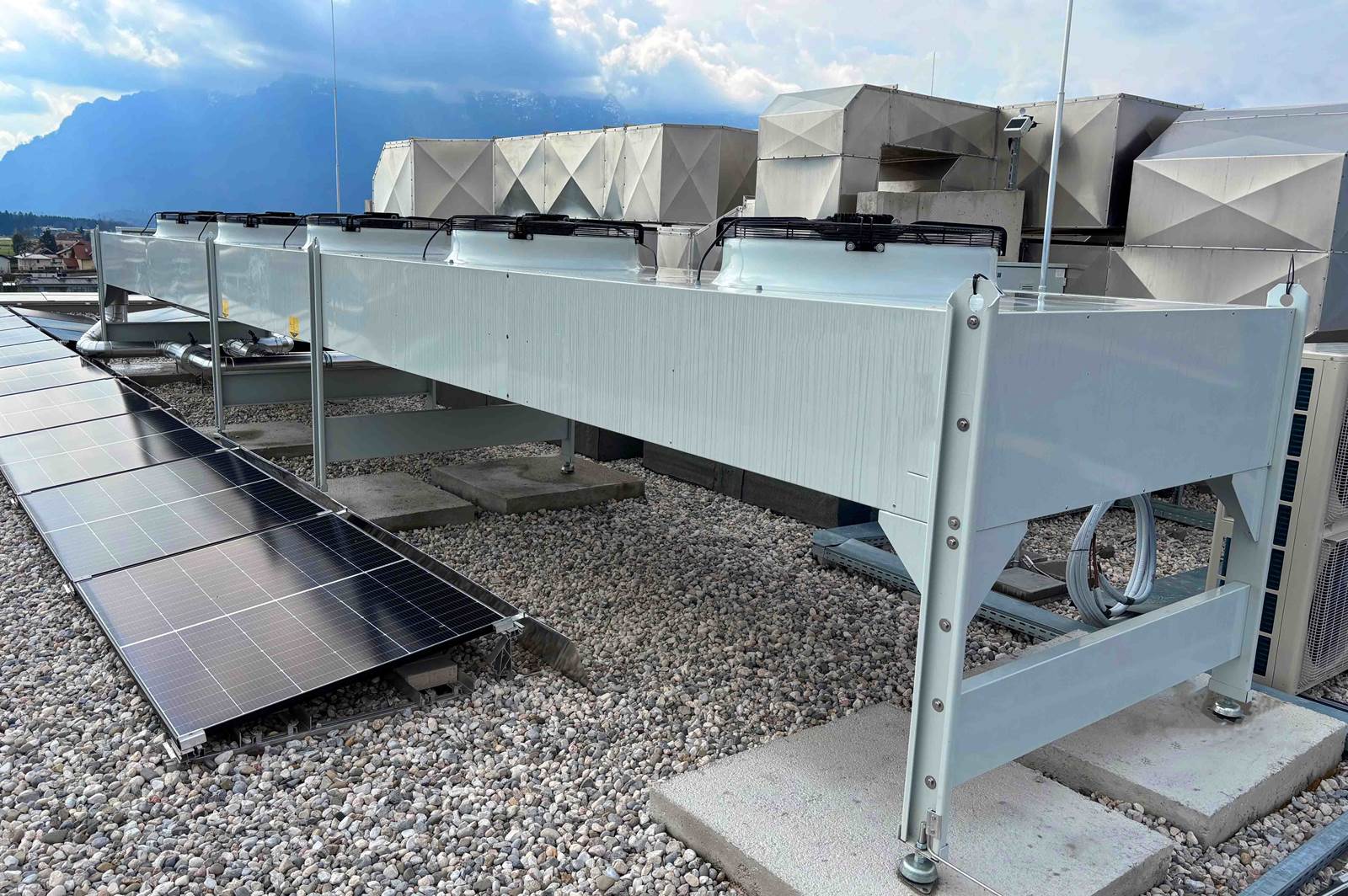 Die Überschussenergie im Sommerbetrieb wird über einen unauffälligen, leisen und durch EC- Ventilatortechnik effizienten und sparsamen Rückkühler der Serie GTK an die Umgebung abgegeben.