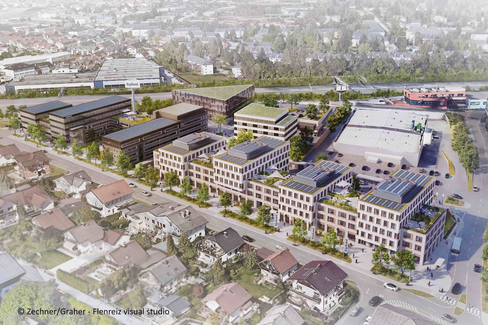 Das AlpAreal Baufeld wird in unterschiedlichen Bauphasen wachsen und sich über vier Teilbaufelder mit neuen Gebäudeeinheiten entfalten.