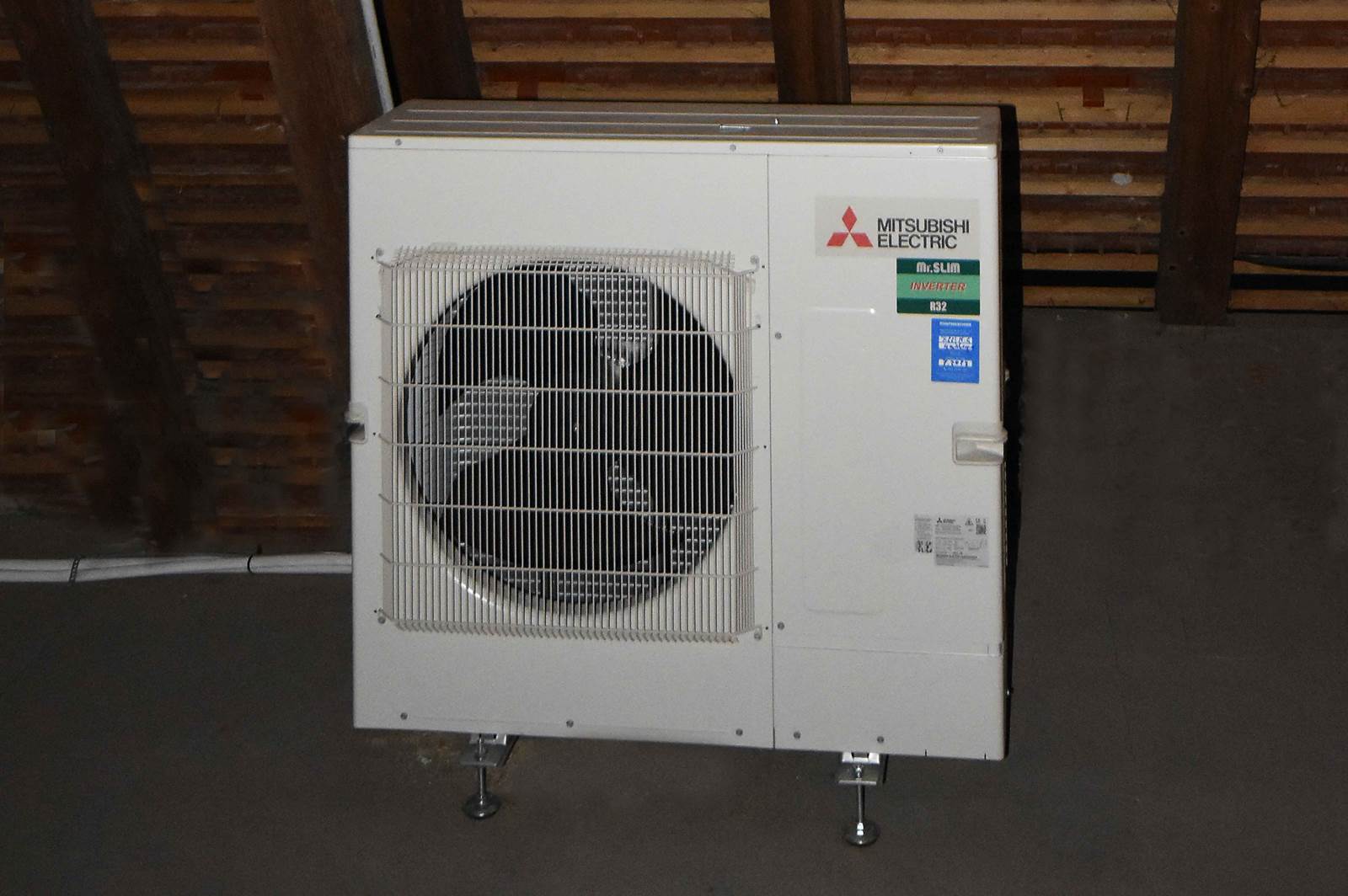 Die verwendeten Mitsubhishi Electric Split-Klima Kanaleinbaugeräte wurden in den Räumen mit ausreichender Zwischendeckenhöhe direkt in diese integriert bzw. in Räumen mit zu geringer Zwischendeckenhöhe unterhalb montiert und separat verkleidet. Die warme Raumluft wird über ein fix verbundenes Ansauggitter in Deckennähe abgesaugt, während sich die abgekühlte Luft in der gesamten Zwischendecke verteilt. In Summe sorgen 16 Lochplatten dafür, dass der Raum aufgrund von Austrittsgeschwindigkeiten <0,5 m/s an den Lochplatten gleichmäßig und annähernd zugfrei gekühlt wird. Die zugehörigen Außengeräte wurden aufgrund des Denkmalschutzes in einem gut durchlüfteten Dachboden montiert. Zusätzlich wurde im Bereich der Außengeräte ein separater Abluftventilator installiert, um einen Hitzestau zu verhindern.
