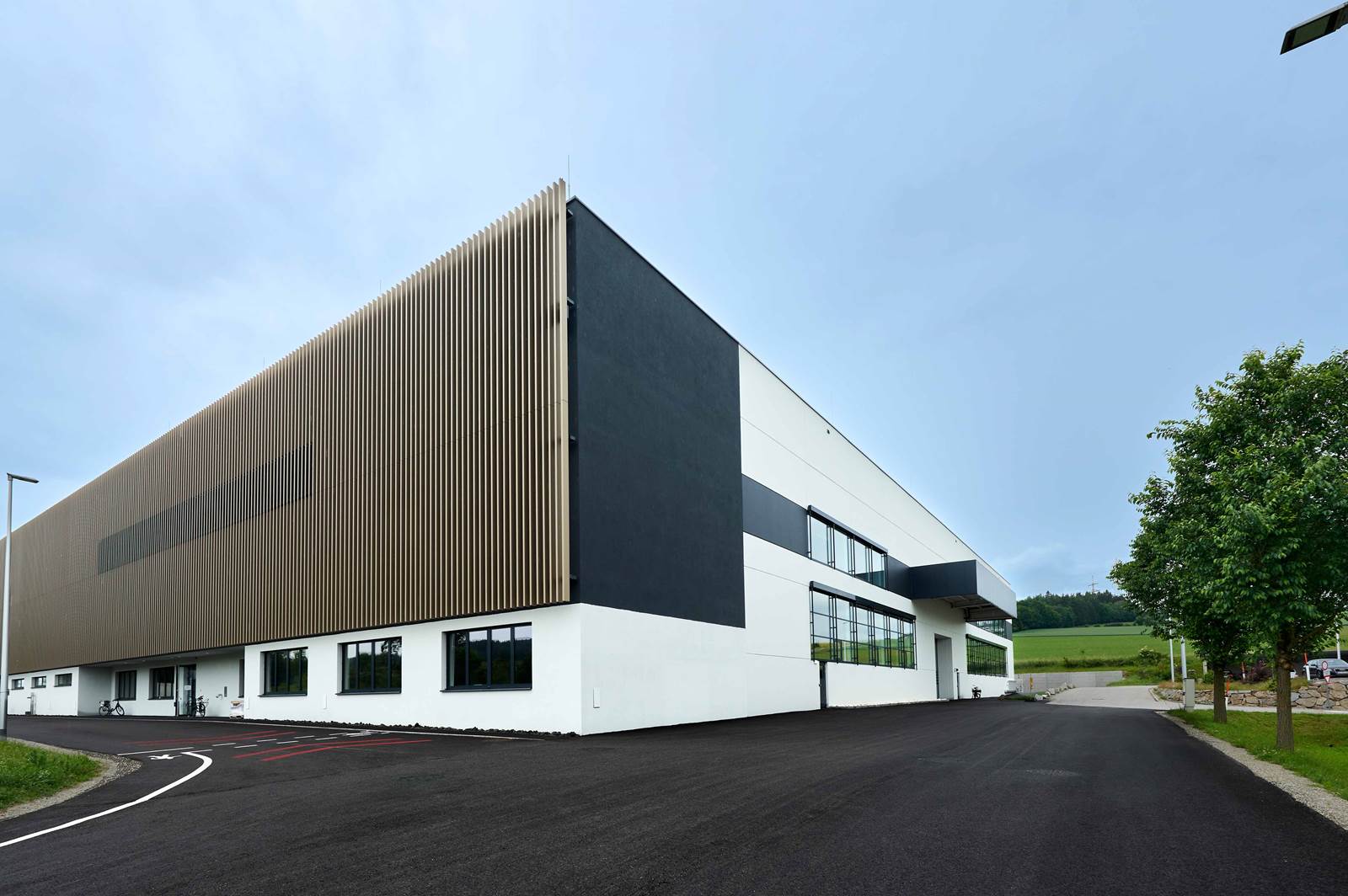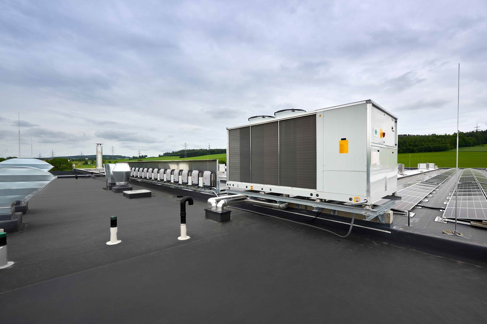 Für die Wärmeversorgung der Hallen, sowie des mehrgeschoßigen Bürogebäudes, sorgt eine reversible FläktGroup-Luft-Wasser-Wärmepumpe der Type GLAH2026CD2.HE (Nennheizleistung 159 KW, Nennkühlleistung 148 KW).