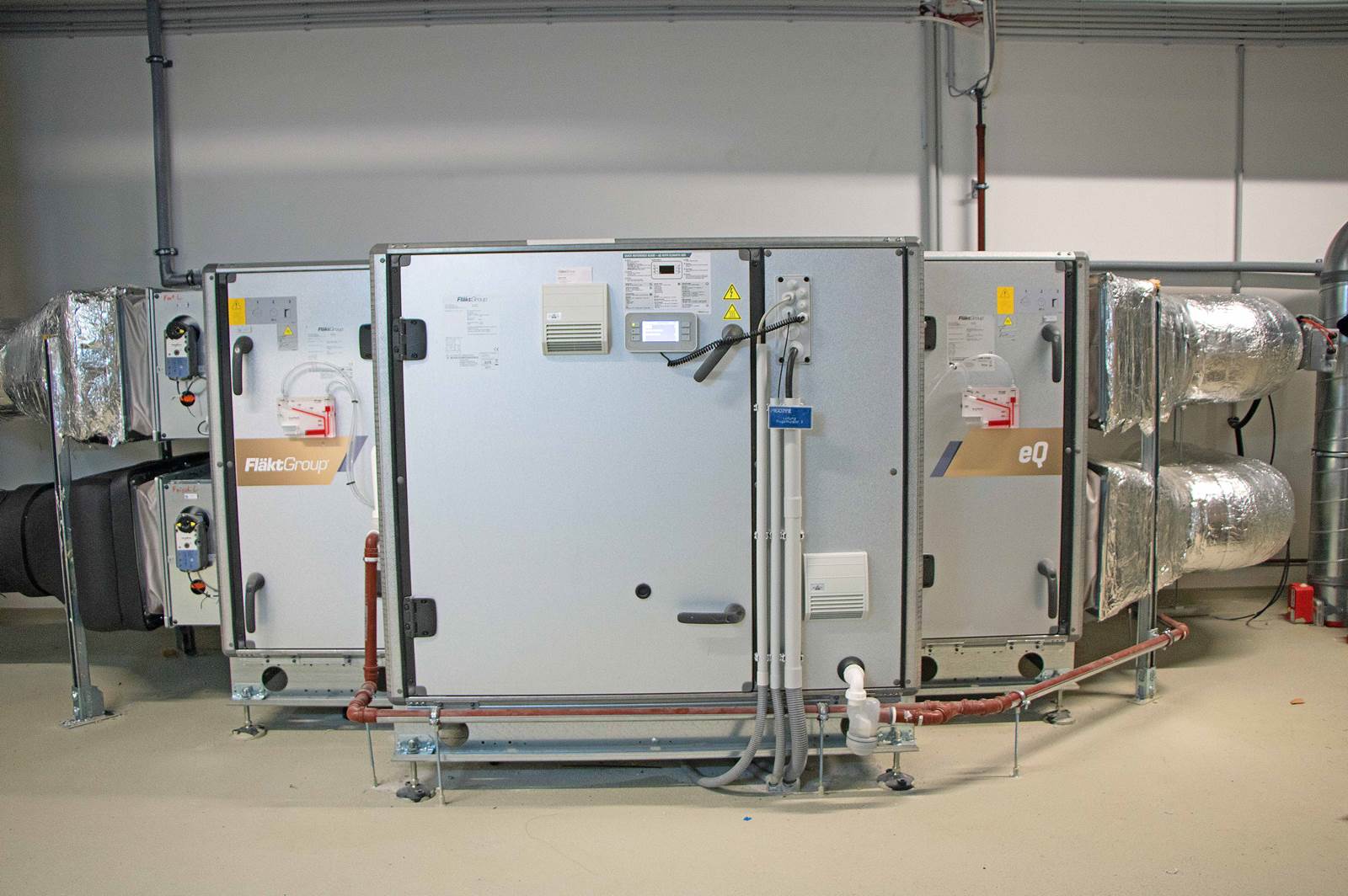 Für die Belüftung wurden vollkommen autarke Lüftungsgeräte mit integrierter Wärmepumpe eingesetzt. Die Geräte verfügen über einen Rotationswärmetauscher als Energierückgewinnung und eine leistungsgeregelte Luft-Luft-Wärmepumpe, reversierbar für Heizen und Kühlen. Diese Kombination ermöglicht im Anlagenbetrieb eine enorm hohe Ganzjahresenergieeffizienz. Um die Außenluft von -15°C auf 22°C aufzuwärmen benötigt man bei 22 °C Ablufttemperatur lediglich 700 Watt elektrische Leistung für die beiden Ventilatoren und 1000 Watt für die Wärmepumpe. Der Rest (23.900 Watt) wird durch den Rotationswärmetauscher und die Wärmepumpe erledigt. Zur Sicherstellung einer optimierten Funktion sind die Geräte kompakt aufgebaut und mit integrierter Regelung ausgeführt. Die Gebäudeleittechnik wird über ein gängiges Bus- System angebunden. Der Probelauf und die kältetechnische Abnahme fanden bereits im Werk statt, denn die Geräte wurden betriebsbereit ausgeliefert. Somit ist gewährleistet, dass der Bauherr bereits eine geprüfte Anlage vor Ort hat. Die Luftmengen für die Anlagen wurden während der Planung, abgestimmt auf die Nutzung, festgelegt.