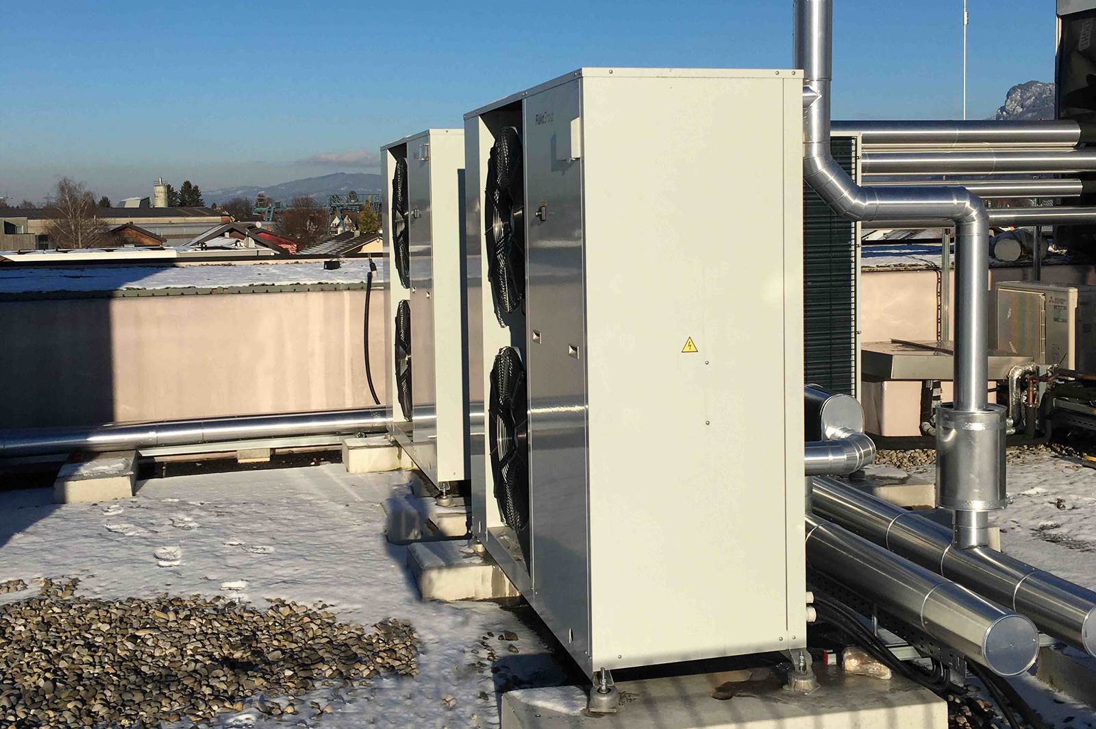 Die 3er-Kaskade, der reversiblen Luft-/Wärmepumpen von FläktGroup, sorgt für die 16 Mitarbeiter ganzjährig für eine angenehme Wärme im Gebäude und im Sommer für eine optimale Kühlung.