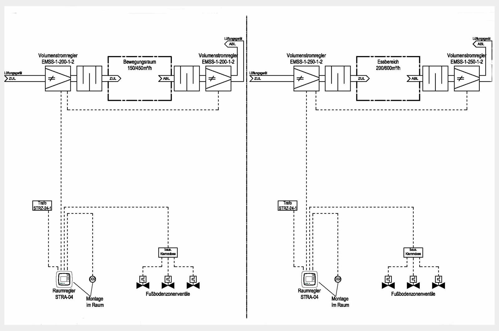Dazu wurden eigene CO2 Luftqualitätsfühler installiert, die je nach Belegung und verbrauchter Luft nur so viel Frischluft zuführen, um die gewünschte Raumluftqualität zu erreichen. Die hier verwendeten FläktGroup Volumenstromregler vom Type EMSS, verknüpft mit dem Raumregler STRA-04, sorgen neben der Luftqualität auch für die Behaglichkeit in Bezug auf die individuelle Raumtemperatur. Hiermit garantiert man maximalen Komfort bei niedrigstem Energieverbrauch.