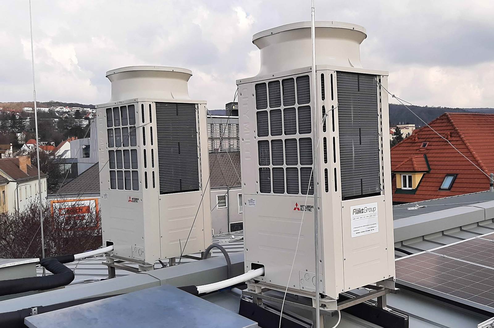 In den 27 Büros sind Wandgeräte verbaut, im Stiegenaufgang 2 Stk. 1 Wege Kassetten. Der EDV-Raum hat eine eigene Klimaanlage, welche für den Ganzjahresbetrieb geeignet ist. Die VRF Anlagen dienen vorrangig zur Kühlung der Büros, können aber in der Übergangszeit selbstverständlich auch zur Beheizung der Büros verwendet werden.