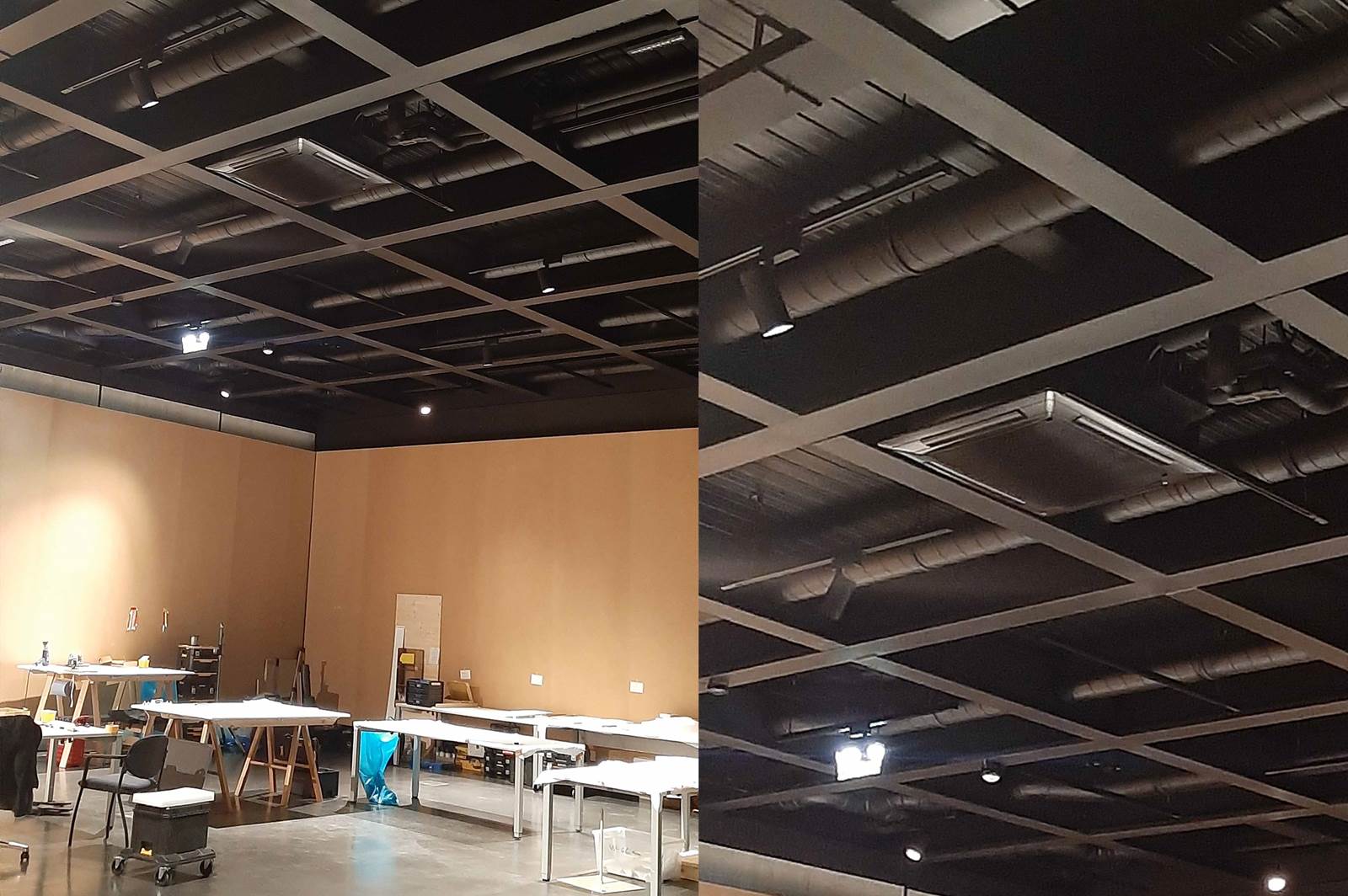 In den Räumlichkeiten, in welchen Sichtmontage gestattet war, wurden die Cassette-Gebläsekonvektoren an die schwarze Deckenfarbe des Gebäudes angepasst. Der Qualitätsanspruch der FläktGroup Cassette-Gebläsekonvektoren zeigt sich in vielen technischen Merkmalen, die zusammengenommen ein perfekt harmonierendes Ganzes ergeben. Die individuell einstellbaren Ausblaslamellen erlauben eine bedarfsgerechte Verteilung der Zuluftströme für zielgerichtete Luftverteilung.