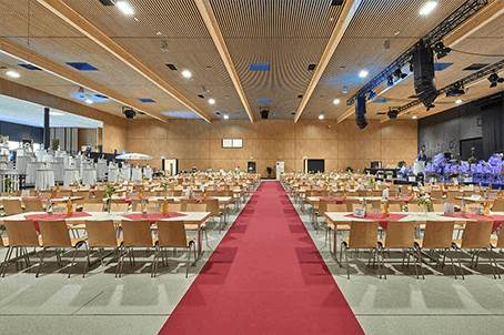 Anforderung: Auf Grund der individuellen Nutzung, die vom Volksfest bis hin zu Fachmessen und Firmenveranstaltungen sowie einer reinen Nutzung der Seminarräume reicht, galt es hier ein Gesamtkonzept für eine individuelle Lösung für Heizung, Lüftung und teilweiser Kühlung/Klimatisierung zu erarbeiten.