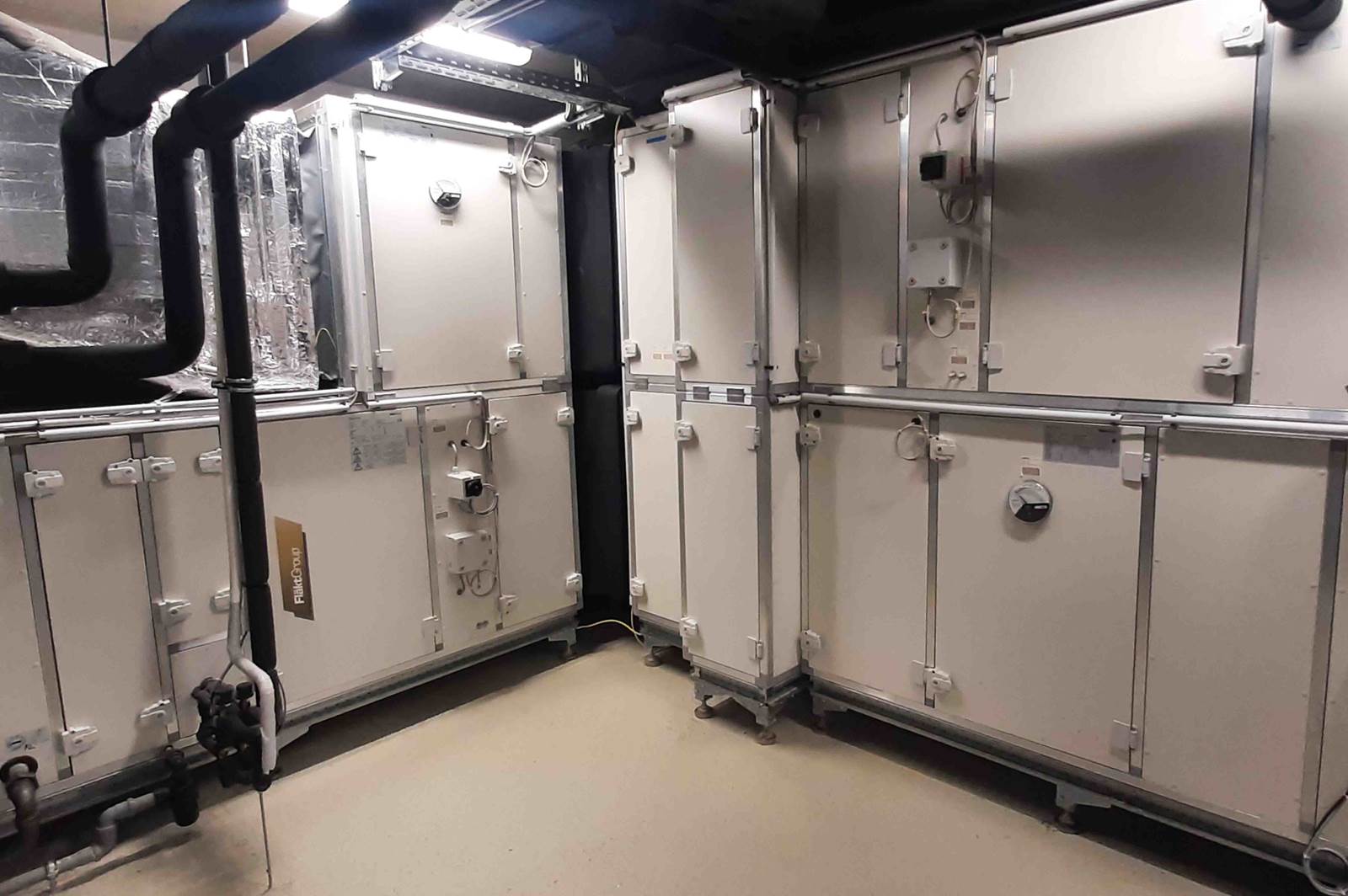 Somit wird hier das FläktGroup CAIRplus Lüftungsgerät, welches über über 8.000m³/h Luftmenge verfügt eingesetzt. CAIRplus-Zentrallüftungsgeräte sind weitestgehend anschlussfertig und in ihren Komponenten optimal aufeinander abgestimmt. Durch hochwertige Kältekreiskomponenten wird hohe Zuverlässigkeit und Langlebigkeit erreicht. Die Luft wird mittels Direktverdampfer gekühlt. Bei der Entfeuchtung wird die, von der VRF-Anlage abgegeben Wärme, zur Nachheizung wieder genützt. Dieses wassergekühlte Klimasystem ist so konzipiert, dass kein externer Rückkühler im Freien installiert werden muss. Die abzuführende Wärme wird über die Abluftseite des Lüftungsgeräts ins Freie geführt.