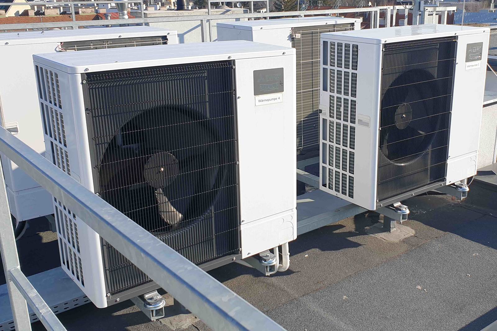 So wird in den Frühjahrsmonaten, während der Keller noch beheizt wird, in den oberen Ebenen bereits gekühlt. Ausgestattet mit einer frei programmierbaren Regelung verwalten wir die Anlage energieoptimiert und sorgen damit auch für ausgeglichene Laufzeiten der Wärmepumpen. Ein weiterer und somit wesentlicher Vorteil, den wir hier bieten, ist eine hohe Betriebssicherheit durch eine Kaskaden-Gruppen-Regelung von 4 Wärmepumpen.