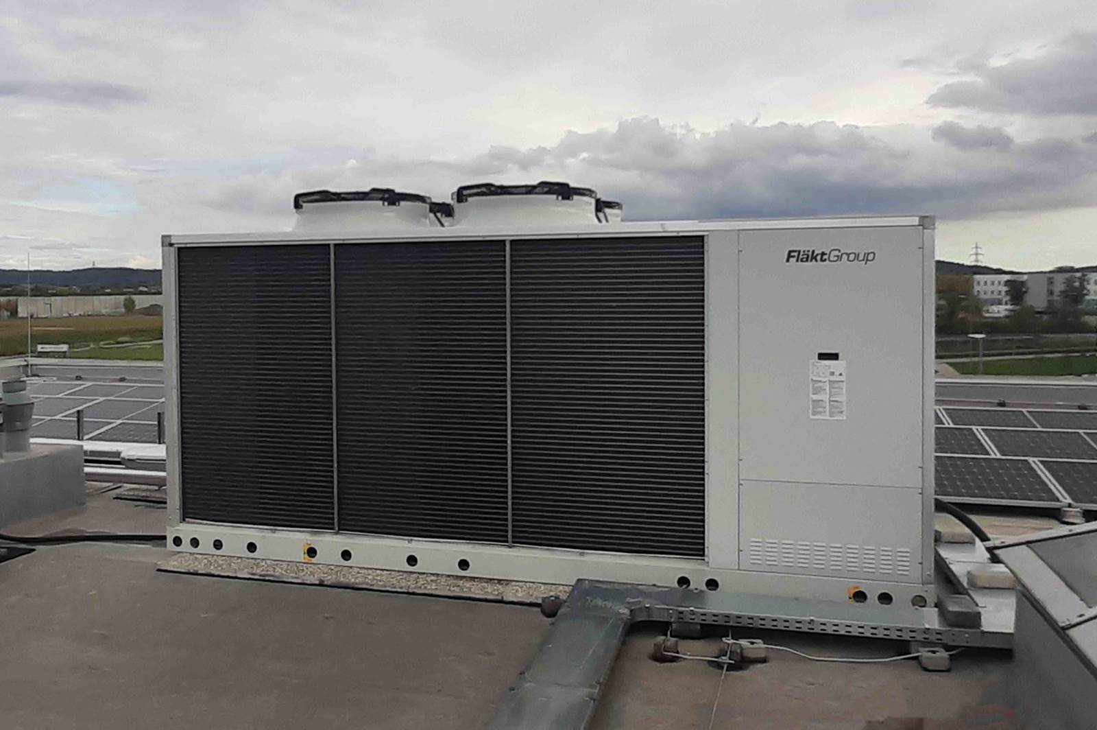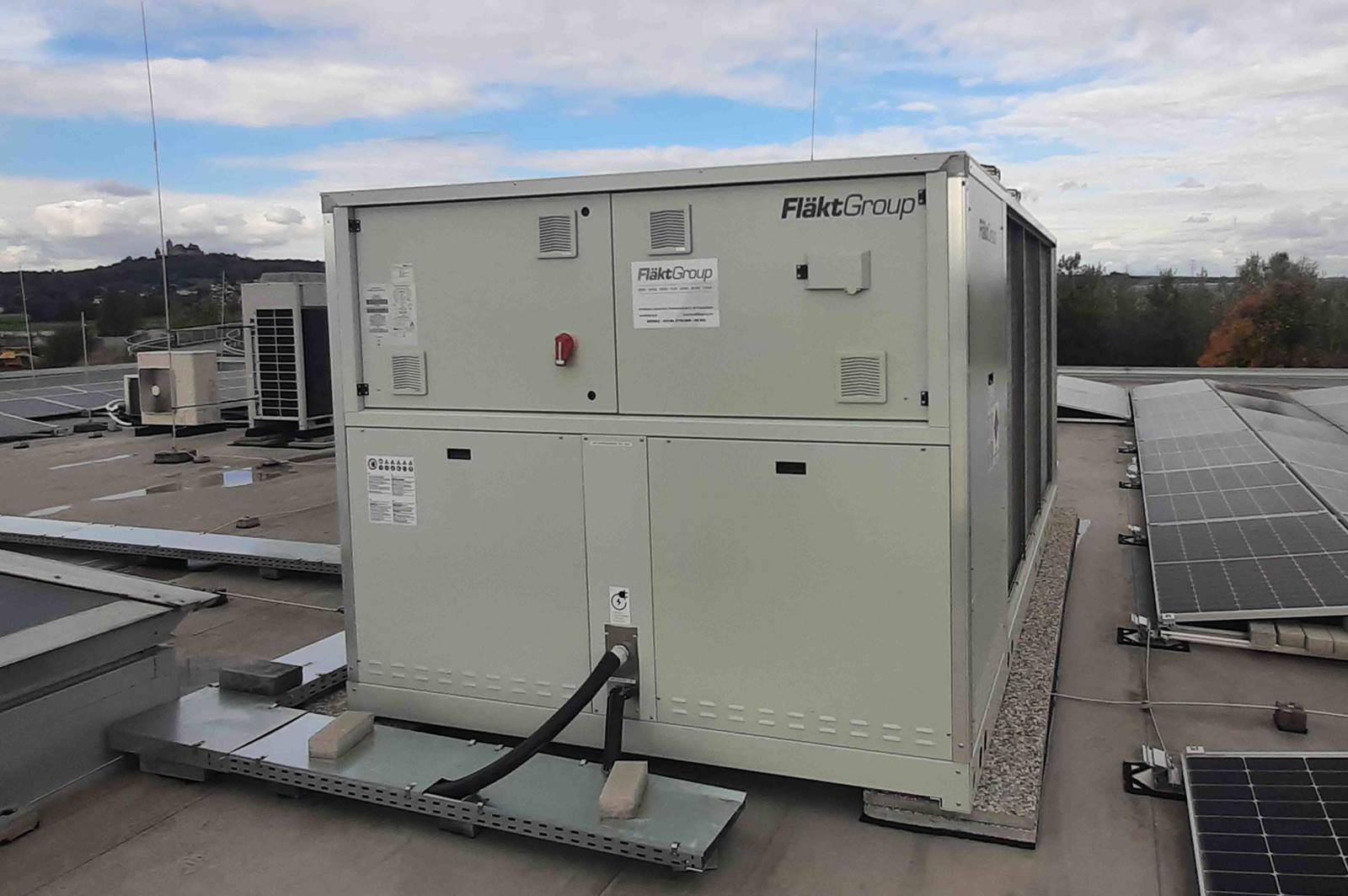 Außen am Dach des Gebäudes wurde die Luft-Wasser-Wärmepumpe FGAH2056AG2.SL mit einer Nennkälteleistung von 138 kW und einer Nennheizleistung von 156 kW installiert. Durch spezielle Gerätebauteile ist das Gerät in der SL-Version besonders leise. In Kombination mit unseren Gebläsekonvektoren ergeben sich effiziente Klimasysteme mit geringstem Treibhauspotenzial (GWP).
