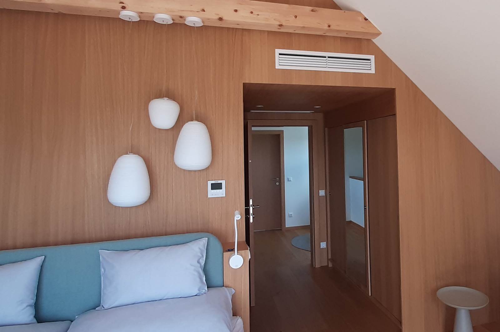 Zur Klimatisierung der Zimmer wurden drei City Multi VRF Anlagen, PUHY installiert. Die City Multi-Serie ist optimal für große und anspruchsvolle Gebäude geeignet, die individuelle Lösungen zur Klimatisierung erfordern. Dank ihrer Grundfunktionen, modernster Verdichter und fortschrittlichem Lüfter sind die VRF-Systeme hocheffizient. Dazu trägt ebenfalls das Strukturdesign der Geräte bei, das mit einem vierseitigen Luftansaugsystem sowie technologisch ausgereiften Kernkomponenten arbeitet. Zudem harmoniert das reduzierte Design des Gerätes mit jedem Baustil und fügt sich zurücknehmend in die Umgebung ein. Die Kanalgeräte wurden in die Zwischendecke der Hotelzimmer integriert. In einigen Räumen erfolgte die Montage des Wandgerätes oberhalb der Türe.