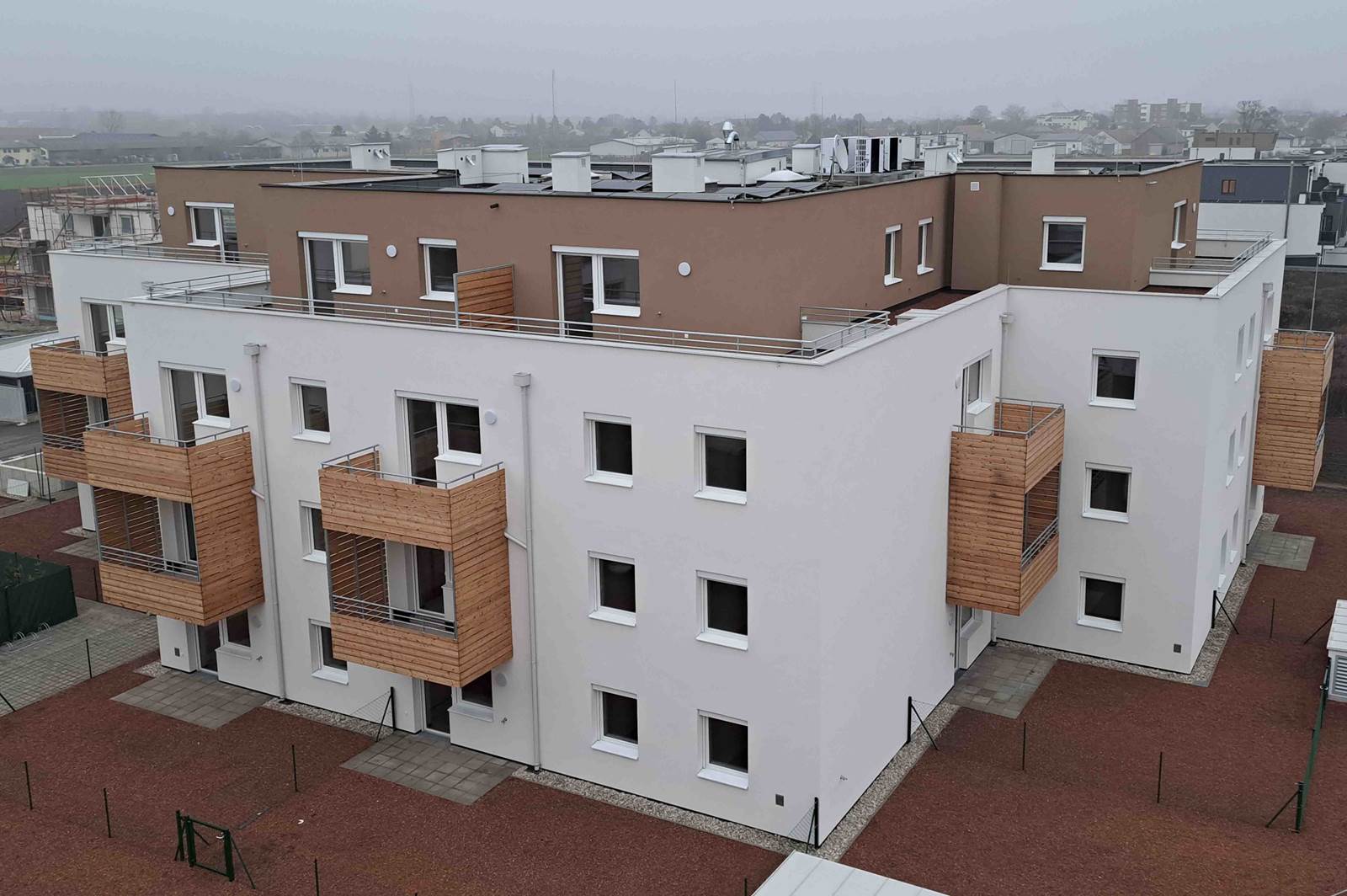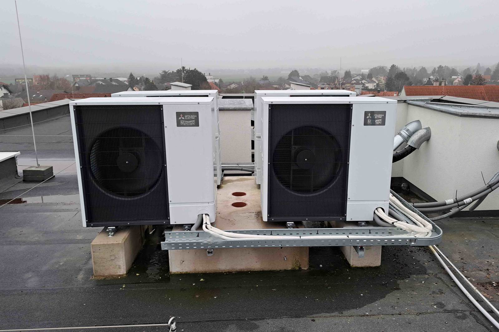 In enger Abstimmung mit der technischen Bauabteilung der MöGen, dem Planungsbüro Woschitz, dem Anlagenerrichter GTN Engineering, Ing. Karl Narnhofer aus Deutsch Wagram und der FläktGroup Austria GmbH wurde hier je Gebäude eine Anlage konzipiert und errichtet, welche sich aus vier Mitsubishi Electric Luft-Wasser Wärmepumpen auf dem Dach und den entsprechenden vier Innengeräten im Technikraum des Gebäudes zusammensetzt.
