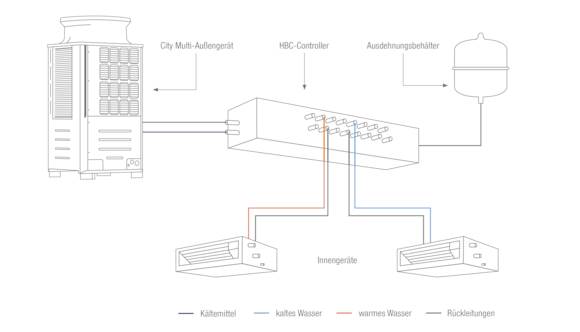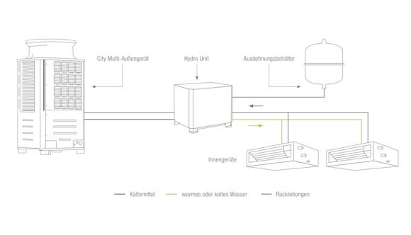 Das City Multi Hybrid VRF-System bietet eine weltweit einzigartige Lösung. Die Stärken eines direktverdampfenden mit denen eines wassergeführten Systems werden hier kombiniert – mit hoher Energieeffizienz, individuellem Komfort und deutlich reduzierter Kältemittelfüllmenge.