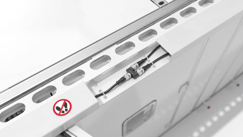Alle Steuerungskomponenten, wie z.B. Sensoren und Stellglieder, sind an das Bussystem angeschlossen. Das Kabel zu jeder Komponente verlässt auf kürzestem Wege das Gerätegehäuse und wird dann im Kabelkanal an der Geräteaußenseite mit einem Schnellverbinder an ein Bussystem angeschlossen. Dies macht die Konstruktion hygienischer und folgt der Empfehlung der VDI6022 für eine möglichst minimale Verkabelung im Luftstrom. Die externe Busverkabelung mit Schnellanschlüssen in der Nähe jeder Blockverbindung ist ein entscheidender Faktor bei der Installationszeit für modulare RLT-Geräte. Je nach Komplexität des Gerätes, kann bei der Elektroinstallation bis zu 40 Stunden eingespart werden. Die Schnellverbinder sind farbcodiert, was die Installation vereinfacht. Zur Elektroinstallation reicht ein Schraubendreher aus. Ein Zugang in das Lüftungsgerät ist nicht notwendig. CAIRplus mit ISYteq 4.0 wird werksseitig vorkonfiguriert und einem ausführlichem End-of-Line Test unterzogen, sodass die Betriebsfähigkeit bei Auslieferung garantiert ist und die Inbetriebnahme schnell erfolgen kann.