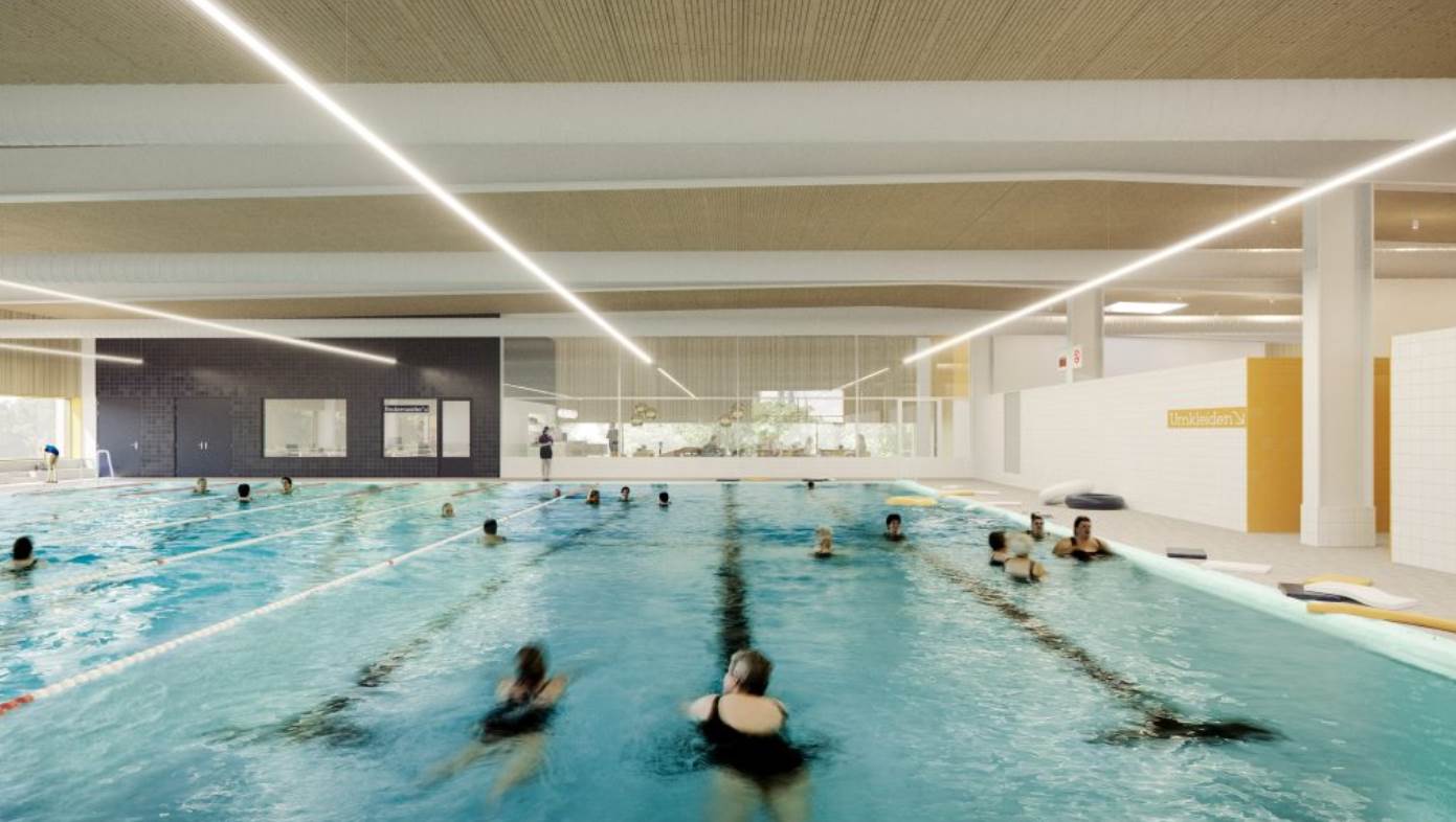 Das Schwimmbecken wird über 8 Schwimmbahnen verfügen. Mittels Einbaus eines über drei Schwimmbahnen längs gerichteten Hubbodens stehen mehr als 200 m² Wasserfläche für Aktivitäten im Flachbereich zur Verfügung. Neben der Schwimmhalle befindet sich ein Gastro Bereich, der einen direkten Blick auf Schwimmaktivitäten bietet.