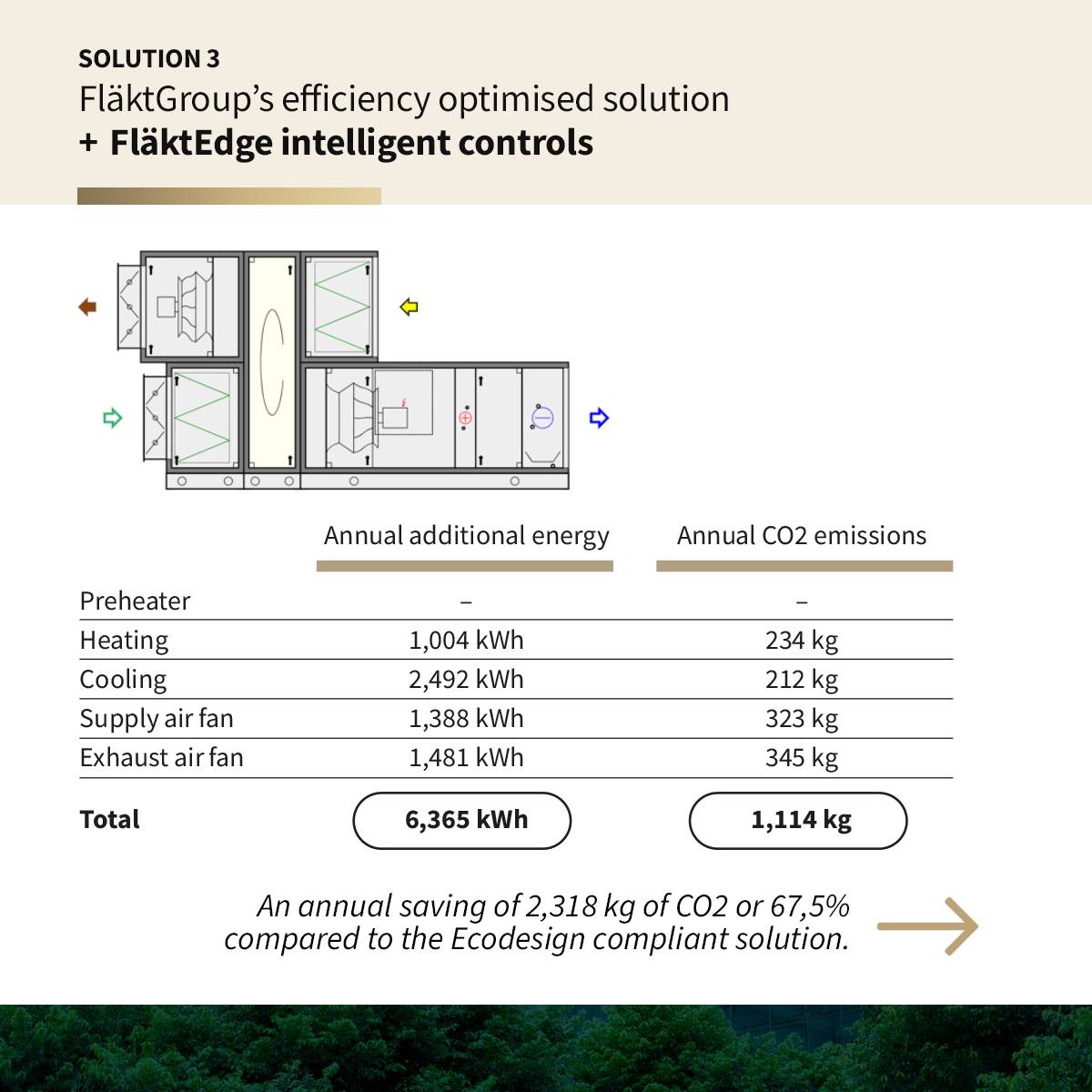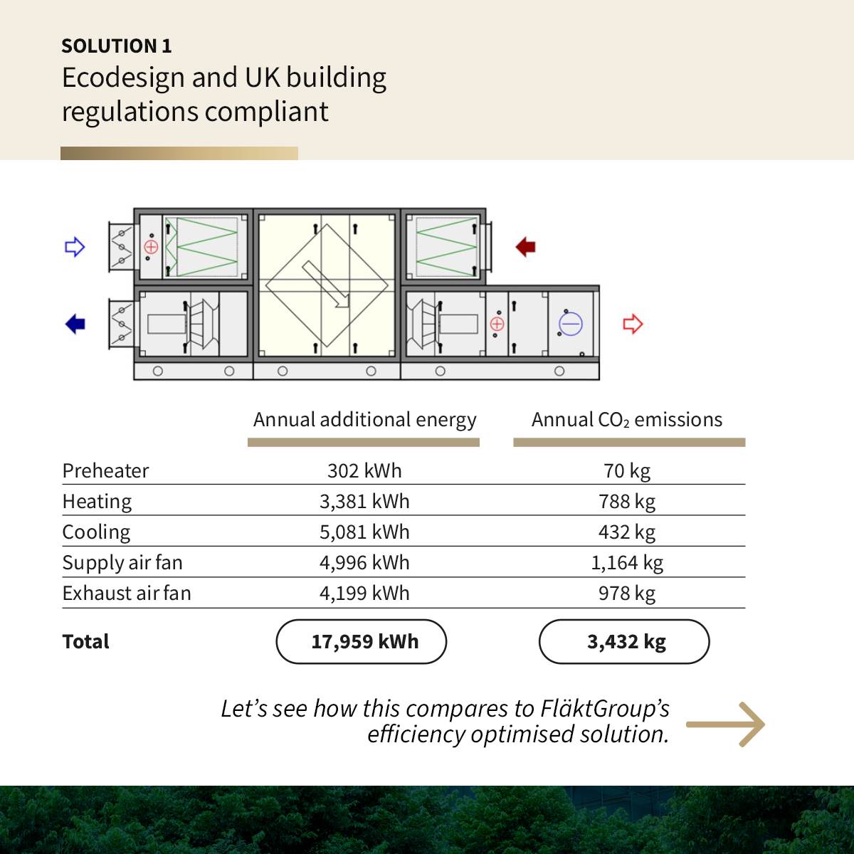 Solution 1 ‘Ecodesign and UK building regulations compliant’ has an airflow rate of 1 m3/s and complies with Ecodesign and UK building regulations and consumes the kilowatt hours of energy (heating, cooling and electricity) shown in the table below and generates the associated carbon emissions also shown.
