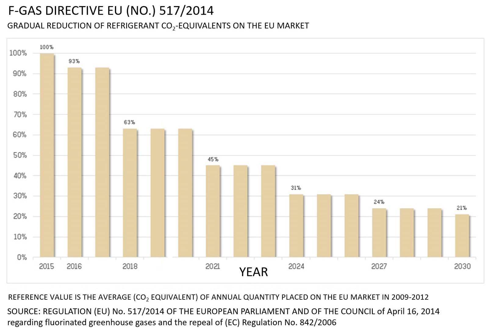 EU Regulation 517/2014, also known as the "F-Gas Directive", provides for a gradual phase-down of the CO2 equivalent of the refrigerants introduced into the EU market by 2030. CO2 equivalent is the product from the amount of refrigerant in kg and its global warming potential (GWP).