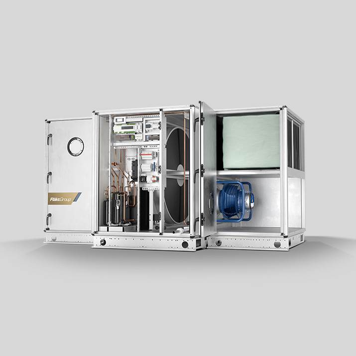 The eQ Master is our range of flexible modular air handling units. The eQ Master has energy saving components such as FläktGroups Ziehl-Abegg Bluefin fans, PM motors, RegAsorp rotor, Econet intelligent run around coil recovery system, integrated heat pump and integrated controls. It offers a comprehensive range of heat recovery systems, filters, fans and other components packed in a hygienic and ergonomic casing to be able to meet the needs of most applications. eQ Master is available in 21 sizes with an airflow from 0.2 m³/s to 12 m³/s.