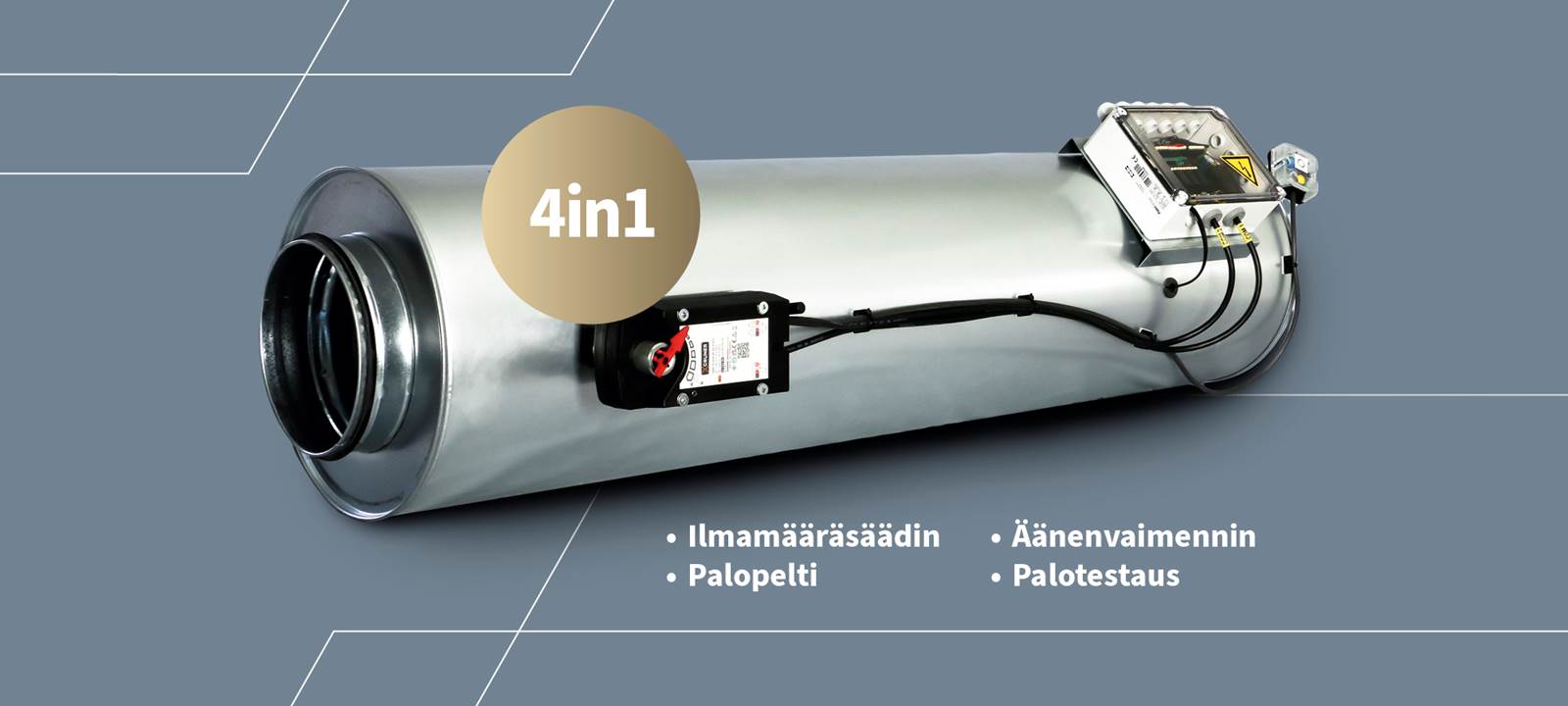 Ilmamääräsäädin, palopelti, äänenvaimennin ja palotestaus samassa