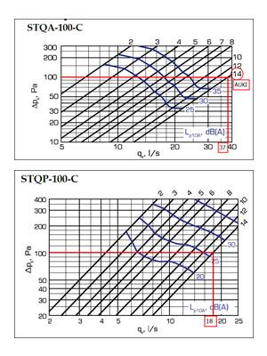 Kuvat selventävät tilannetta tuloilmapuolella. Molemmissa venttiileissä (STQA ja STQP) palotilanteessa ilmamääräsäädön / kuristuksen teippi oletettavasti palaa pois ja päätelaite menee ns. maksimi-ilmavirralle (100 Pa). STQA-venttiilissä maksimi-ilmavirta 100 pa:lla on noin 37 l/s, jolloin kun näitä on tilassa kaksi niin kokonaisilmamäärä ylittää sallitun 42 l/s, 100 Pa. Tämän takia näihin tiloihin tulee suunnitella ja asentaa STQP, kun venttiileitä halutaan käyttää myös savunrajoittimina. Tällöin kahden venttiilin kokonaisilmamäärä on 36 l/s, joka jää alle sallitun 42 l/s, 100 Pa.