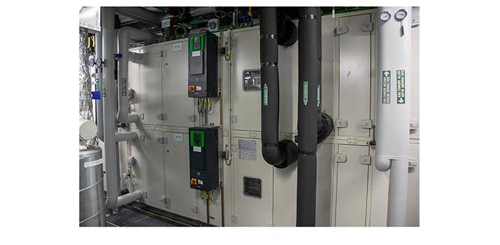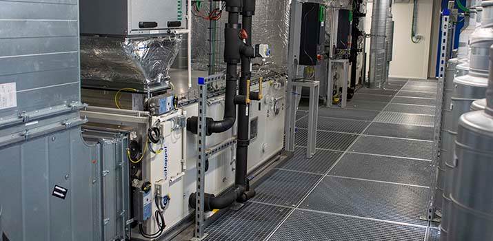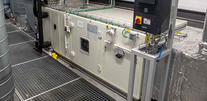 L’installation de ventilation se trouve à l’étage, juste au-dessus des logettes avec une pulsion et une aspiration directes via le plafond. Le concept est une installation à deux niveaux. Il y a tout d’abord une amenée d’air centrale (d’air neuf à concurrence de 10 à 20%) avec une centrale de traitement d’air classique, qui alimente les recycleurs des logettes distinctes. Il s’agit d’une CAIRplus de 7.800 m³/h, qui intègre une batterie de récupération, une batterie chaude et une batterie froide, des filtres F7/F9, un humidificateur à vapeur et un amortisseur de bruit. Cette centrale est reliée à l’échangeur de chaleur via des conduites de glycol, afin d’assurer la récupération de chaleur issue de l’air évacué. Dans la mesure où l’air est aspiré à une température d’environ 20°C, le potentiel de récupération de chaleur est important : en hiver, il est ainsi possible de réchauffer l’air extérieur de -10°C à +4°C.