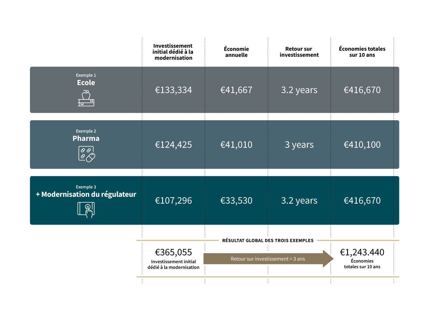 Il est important de noter que le retour sur investissement indiqué reflète le volume d'investissement spécifique de chaque projet individuel, offrant ainsi une vision réaliste et transparente de l'efficacité et du délai de récupération obtenus.