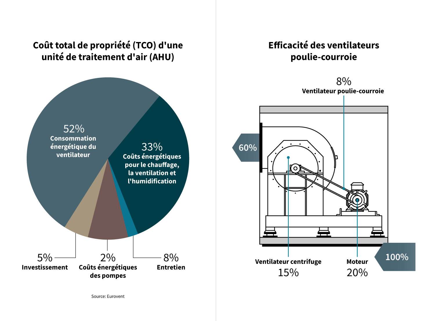 Sur la droite, nous illustrons la perte d'efficacité associée aux ventilateurs à entraînement par courroie. En raison des composants mécaniques et des pertes de transmission, jusqu'à 40 % de l'efficacité du ventilateur peut être perdue, ce qui rend les solutions modernes à entraînement direct beaucoup plus intéressantes.