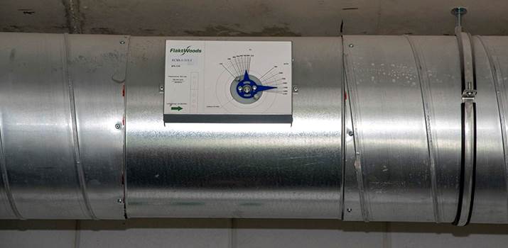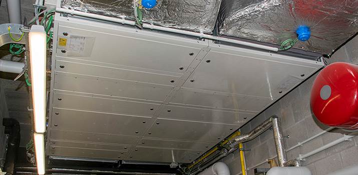 De ingebouwde VAV-schuif op de koelbalken draagt bij aan de duurzaamheid van de installatie. Deze regelbare schuif werkt vraaggestuurd, en is zo opgebouwd dat de installatie steeds op een zo laag mogelijk debiet zal functioneren. “Het toestel is zodanig ontworpen dat het nooit op het maximale niveau zal blijven draaien. Aan de hand van CO2-metingen wordt het debiet ingesteld: is er weinig volk aanwezig in de ruimte, hoeft de installatie niet op volle capaciteit te draaien. Indien het CO2-peil te hoog wordt, wordt het debiet automatisch verhoogd. En dus wordt er zo weinig mogelijk energie verbruikt. Dat is op alle vlakken voordelig: hoe minder lucht er wordt binnengebracht, hoe minder lucht er behandeld moet worden, hoe langer de filters standhouden, en hoe minder gekoeld en bevochtigd er moet worden. We kunnen dus spreken van een kettingreactie waardoor er energie bespaard wordt.”