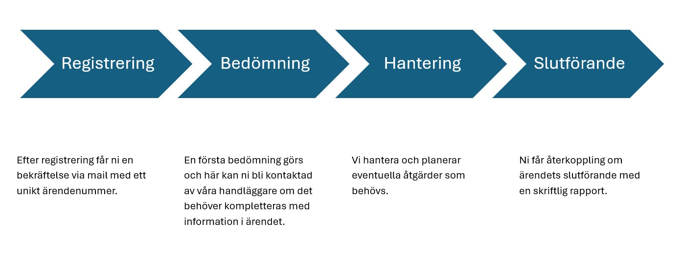 - Uppgifterna skickas via den tekniska plattformen till vår funktionsbrevlåda och registreras därefter i vårt reklamationssystem för vidare handläggning.
