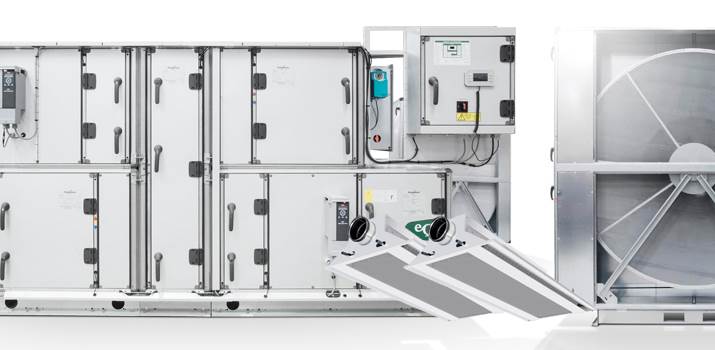 Rotary heat exchangers are used for energy efficient heating and cooling recovery, with the controller operating rotors and cooling coils in sequence to dew-point set-point value, thereby limiting the supply air humidity level whilst maintaining a precisely matched indoor air quality, ideal for chilled beam systems.